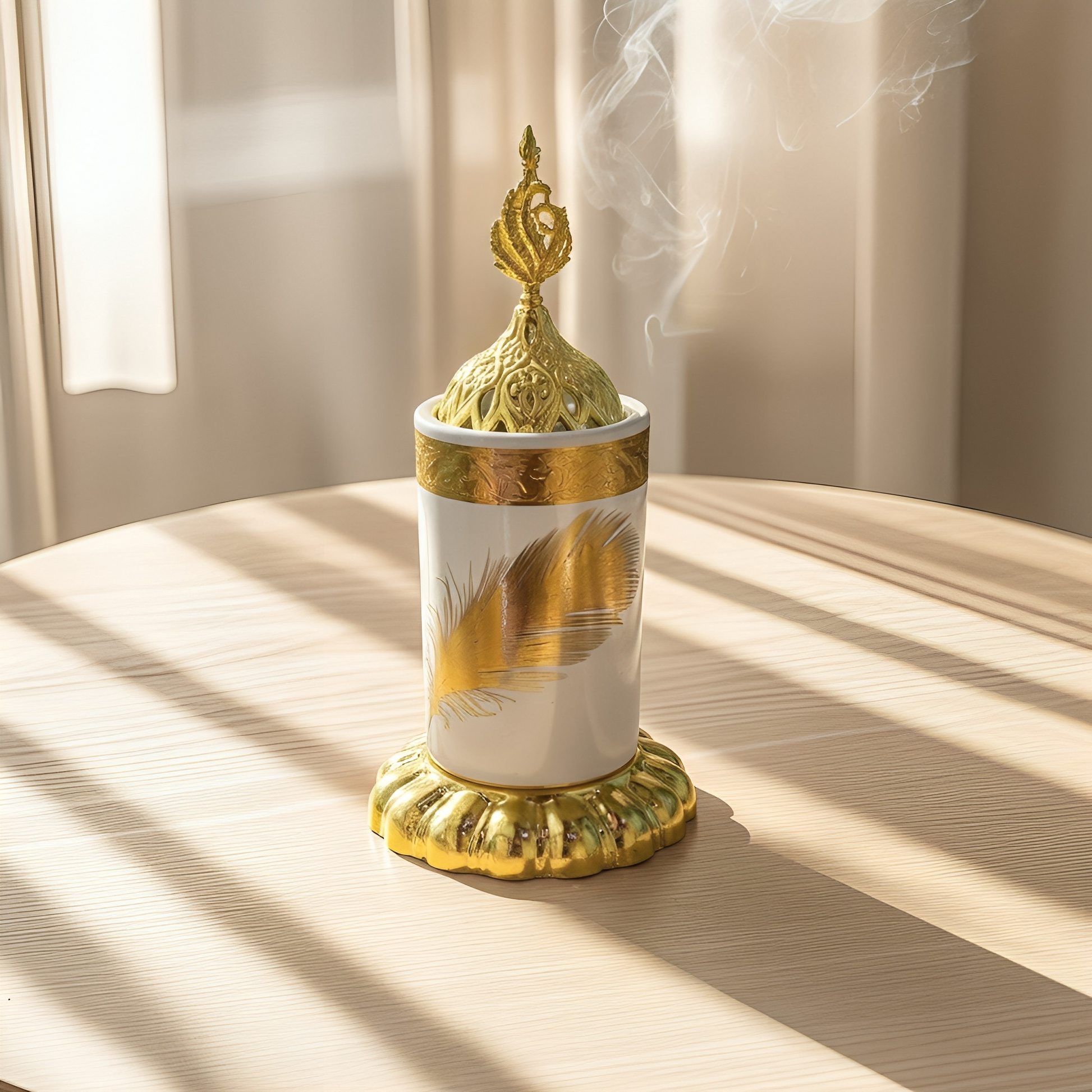 مبخرة بورسلين بغطاء مزخرف  بلون ذهبي لامع مع لون ابيض له بريق أخاذ